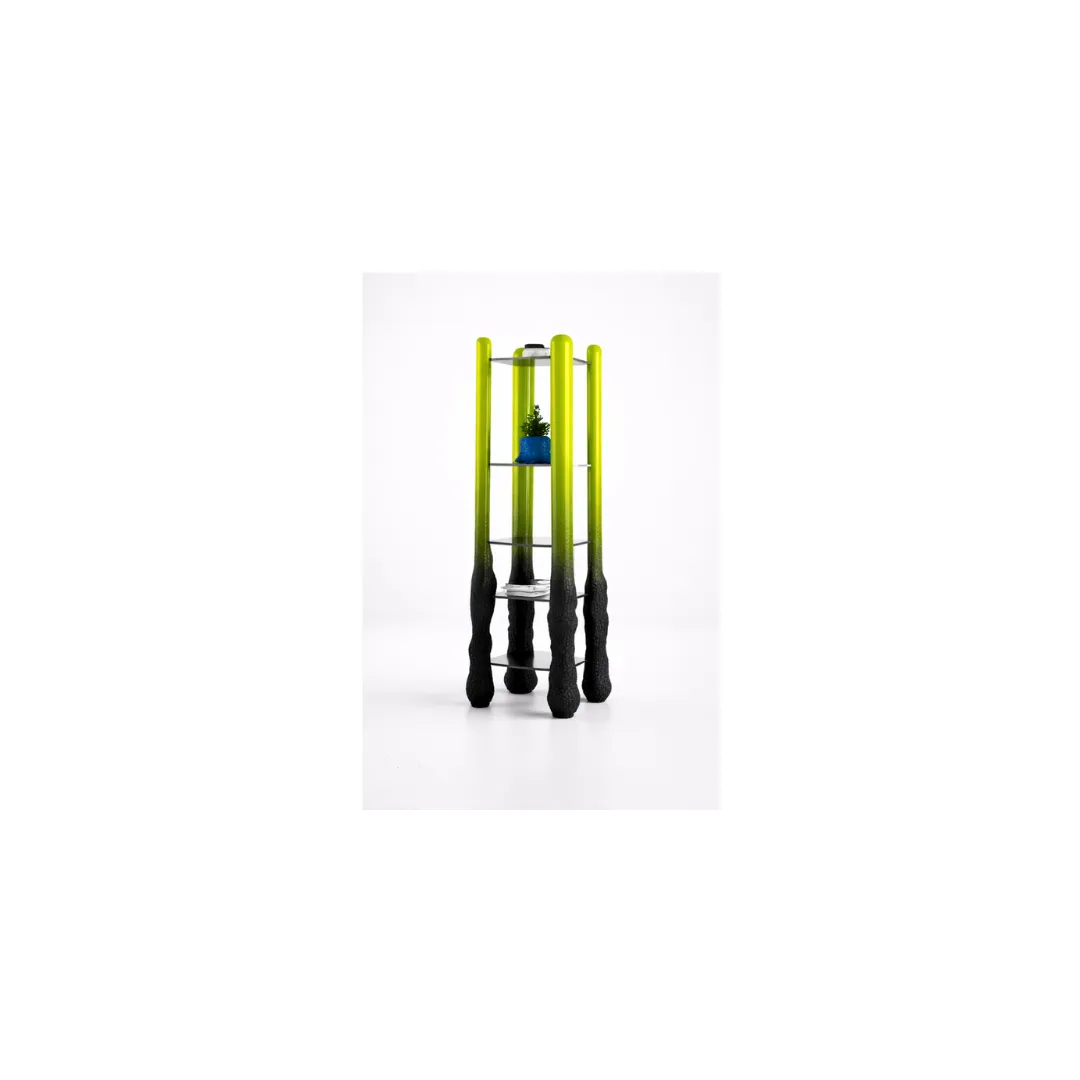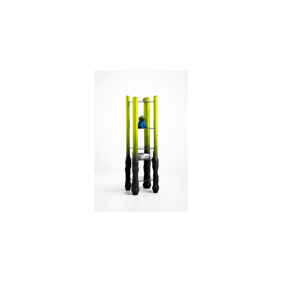 Towering and visceral, the Monster Single Shelving Unit is a sculptural frame that merges utility with raw expression. Its molten gradient legs rise like molten pillars, grounding transparent glass tiers that balance chaos with clarity