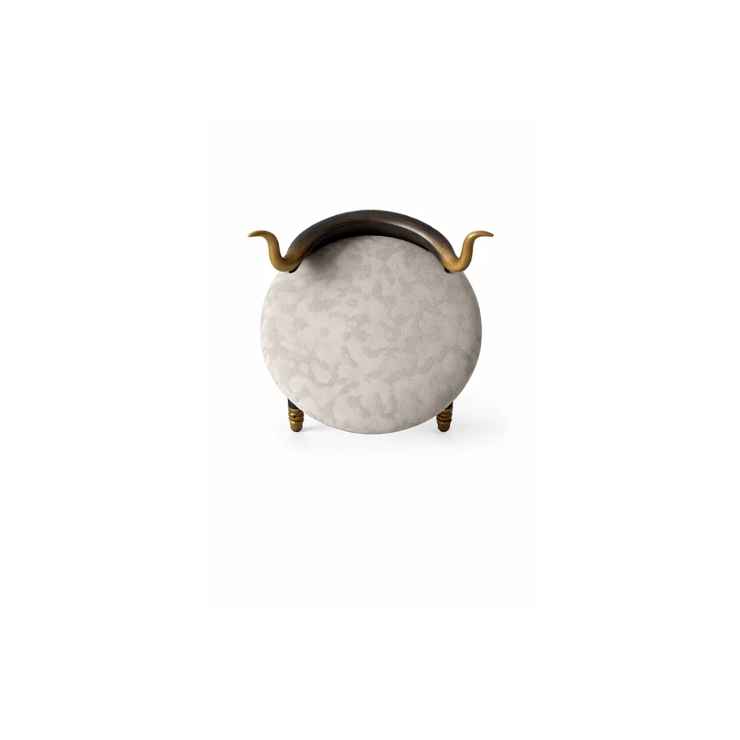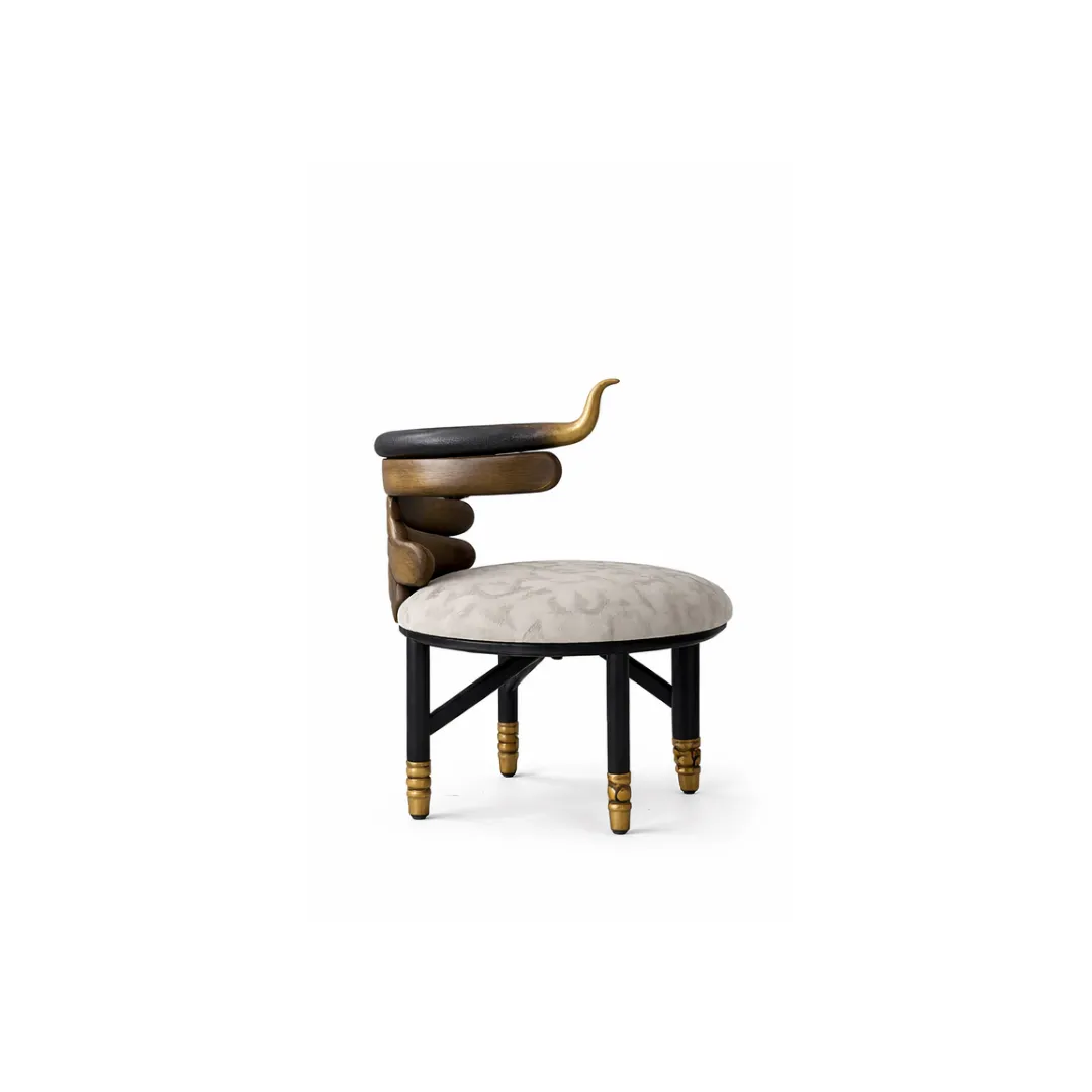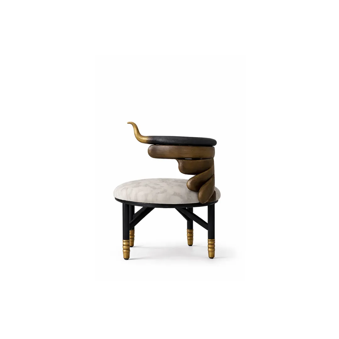 Our Mzizi Dining Chair draws its name from “roots” grounding every dining experience in design that feels both primal and refined. Its bold backrest loops into a sensuous arm form, finished in rich tones and accented with hints of metallic warmth. The seat, upholstered in tribal-inspired fabric, offers comfort without compromise. With its commanding silhouette and artistic poise, Mzizi is not just a chair — it’s a conversation piece.