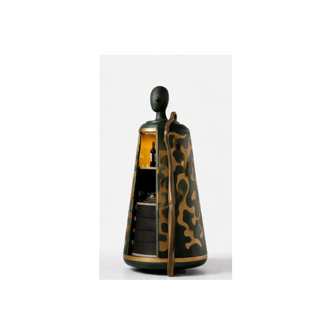 Our ZURI Bar Cabinet rises like a guardian figure, sculpted to echo tribal forms. Brass inlays flow across a deep green body, recalling ancestral markings and rhythmic patterns. A golden-lit core opens to reveal shelves for wine, glassware, and essentials, bringing warmth against the bold exterior. Every curve carries ritual and protection, turning storage into a ceremonial experience. A functional sculpture anchoring moments of gathering.